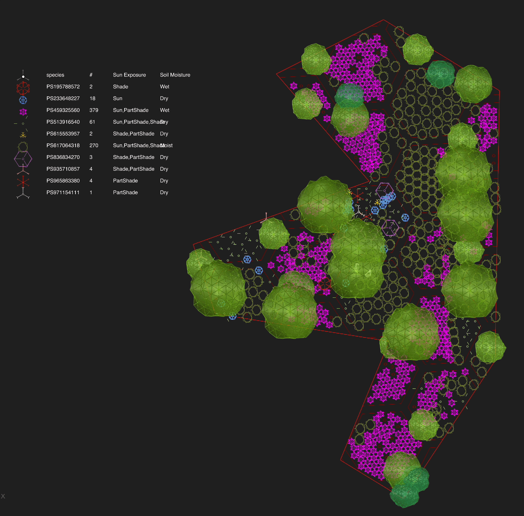 3. Create Pseudo Species Component - When we first released Land Kit, we introduced the option for “pseudo plants”. These have allowed you to design, test, and learn in more abstract ways without having the perfect plant data. But we noticed that these tools have limited features. So we have introduced a new component that procedurally creates “fake” plants. Each pseudo plant has plausible parameters based on its plant type. There are 45 different data fields that are generated randomly for each plant including cluster radius, self spacing, nutrients, and more.
