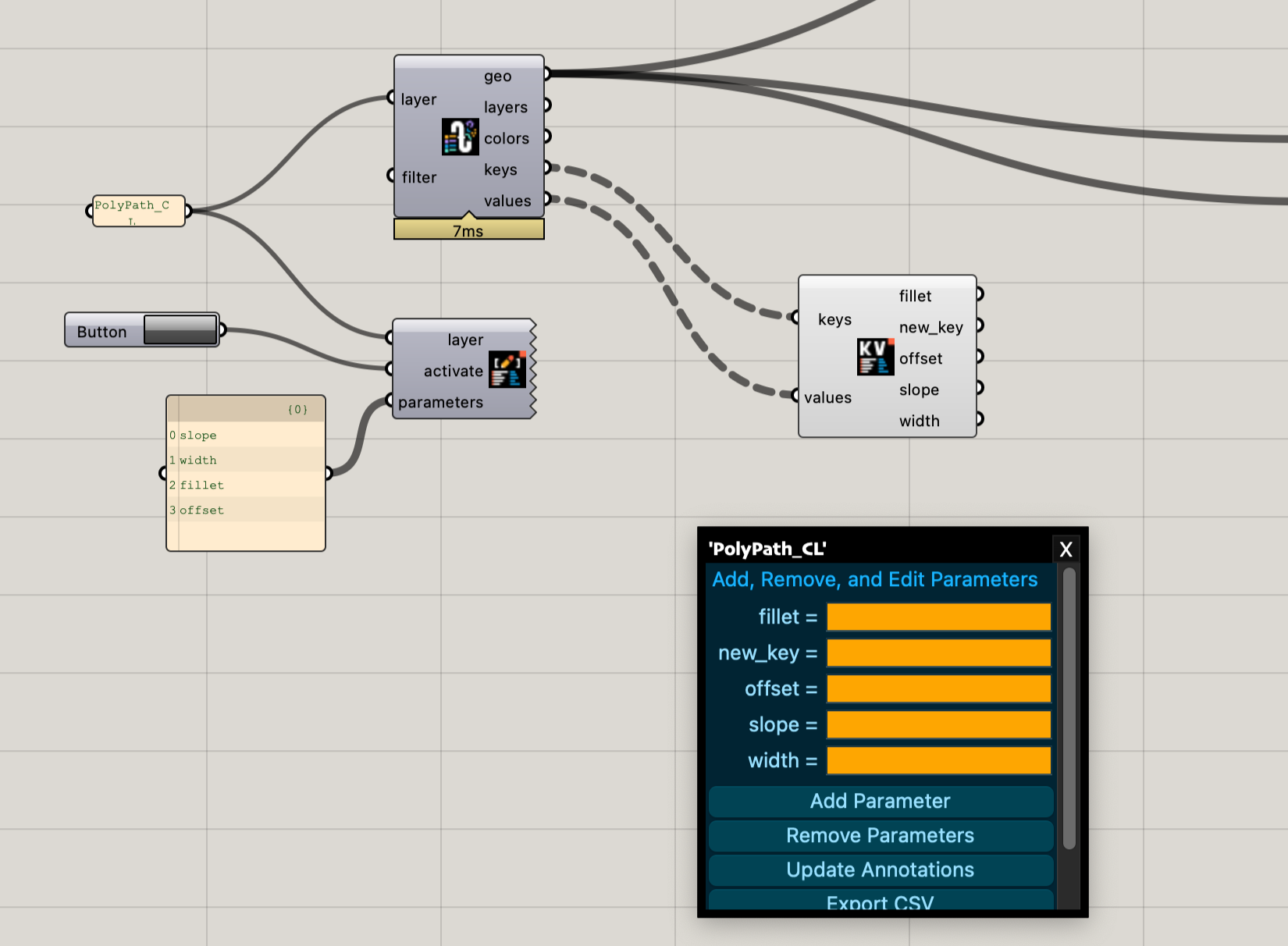 6. Customize Parameters Component - This is the big one. You can make per-geometry adjustments, create a spatial database, or leverage information modeling in Rhino, all with one tool. You can assign, change, and remove keys and values for different parameters using an adapting panel. This also allows you to generate annotations and export CSV files of your data.